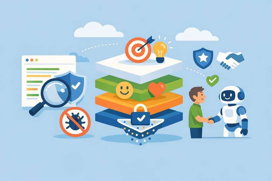 In der Praxis läuft jede Abfrage durch mehrere Tore hintereinander. Zuerst muss der Crawler nichts Verdächtiges finden (Spam). Dann wird geprüft, ob Seiten sicher sind (Safety). Danach ordnet die Maschine die Anfrage einer Nutzerabsicht zu (Intent). Erst danach stellt sie fest, welcher Inhalt vertrauenswürdig genug ist (Trust). Fällst du an einem Punkt durch, ist alles dahinter hinfällig.
